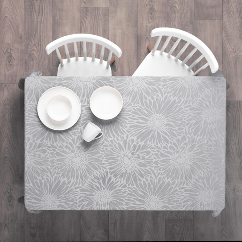Mantel de poliéster - lino con tejido jacquard. Disponible en tres medidas. Lavar a máquina con agua fría a 30°C. No blanquear. No usar secadora. Planchar a temperatura baja. No lavar en seco.