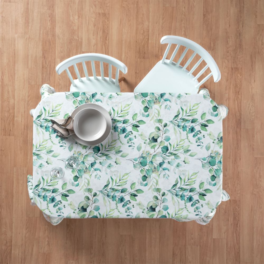 Mantel de poliéster y algodón con diseño jacquard estampado. Producto disponible en 3 medidas. Lavado a máquina con agua fría. 30º. No blanquear. No usar secadora. Planchar a temperatura baja. No lavar en seco.